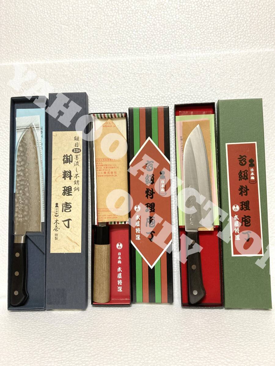 - ★未使用 日本橋 木屋 包丁3本まとめて 墨流し 鎚目33層 不銹鋼 カーボンハイステレス 木屋康宏 本割込 義久 出刃包丁 洋包丁 三徳 和包丁