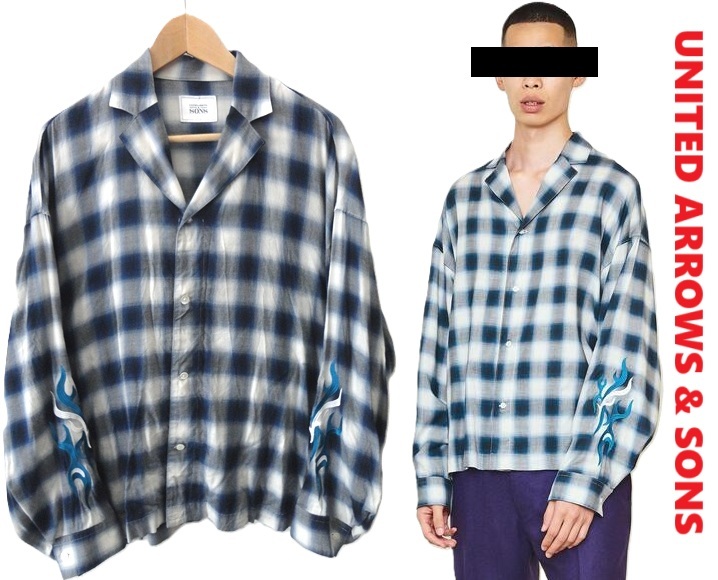 > UNITED ARROWS&SONS:ユナイテッドアローズ&サンズ/HOMURA SHIRT/刺入り オンブレチェック オープンカラー ボックス レーヨン シャツ/M