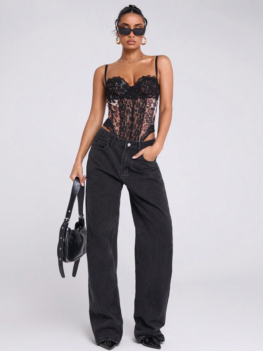- ボディスーツ 女性の春夏のビーチバケーション エレガントなセクシーなヒョウ柄 レースコントラストコルセットボディースーツ、コンサー