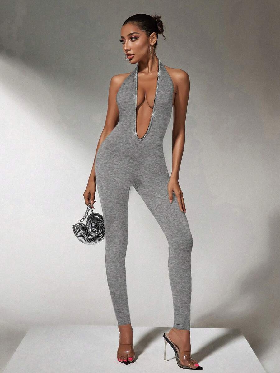 - ボディスーツ 秋 レディースファッション; ワンピース 深ネック ラインストーン レディース ブラックボディスーツ; カジュアルデ