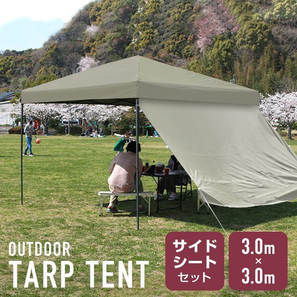 > 【サイドシート付】ワンタッチ タープテント 3m 収納ケース 軽量 スチールフレーム 簡単組立 UVカット キャンプ アウトドア BBQ コヨーテ