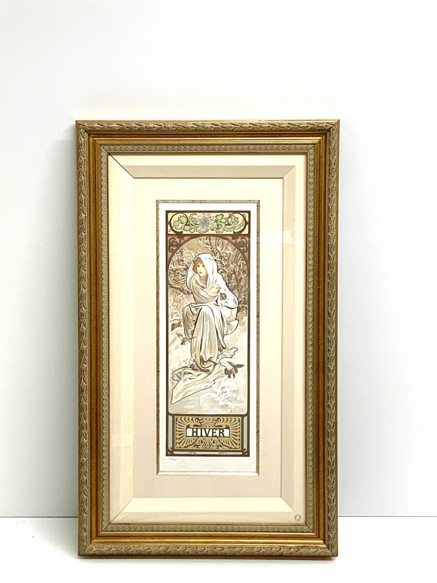 > C208【真作】アルフォンス・ミュシャ『冬 (1897)』126/300 E・D 版画 リトグラフ 直筆サイン 額装 黄袋 紙箱 絵画 額装 MUCHA