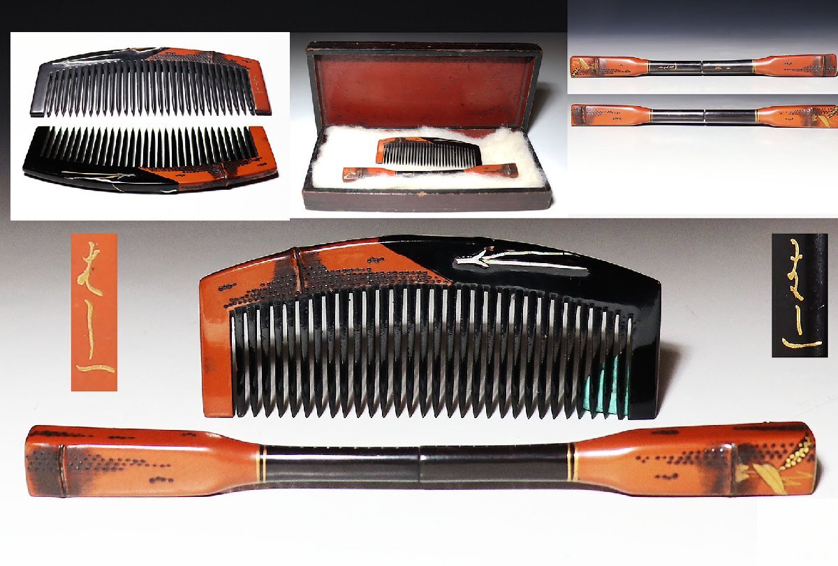 - 【桃】アンティーク髪飾り:漆地貝螺鈿竹節図櫛笄 はし一