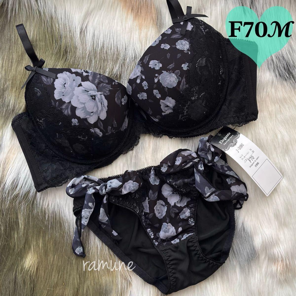 - 【F70-M 黒 上下セット】新品 ブラ&ショーツ ブラジャーショーツセット パッド付き リボンパンティ バラ柄 薔薇プリント 寄せ上げ Fカップ