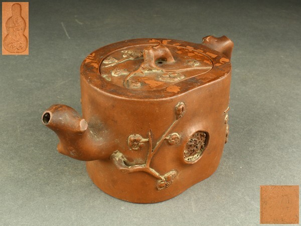 > 【宇】JD403 唐物 宣興紫砂名壷 梅古木彫 蓋裏落款 朱泥急須 煎茶道具