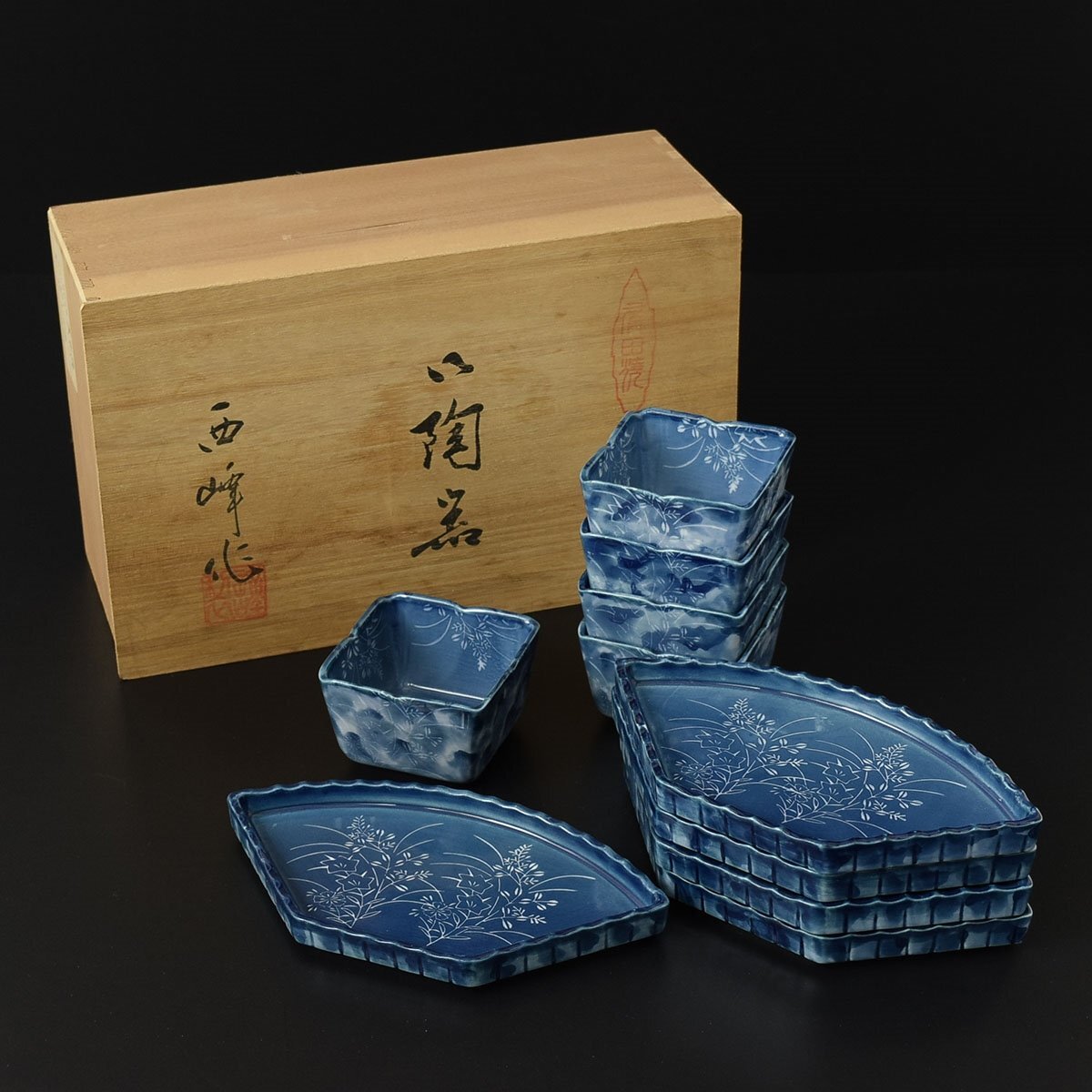 - ◎548323 未使用品 有田焼 雅祥窯 西峰造 墨はじき萩 末広料理揃 扇型皿 小鉢 箱入