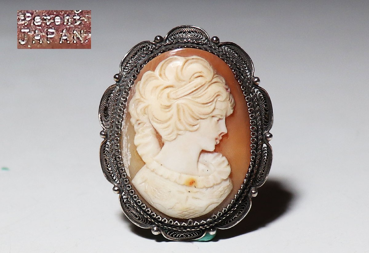 - 【桃】アンティーク:金工銀台シェルカメオブローチ