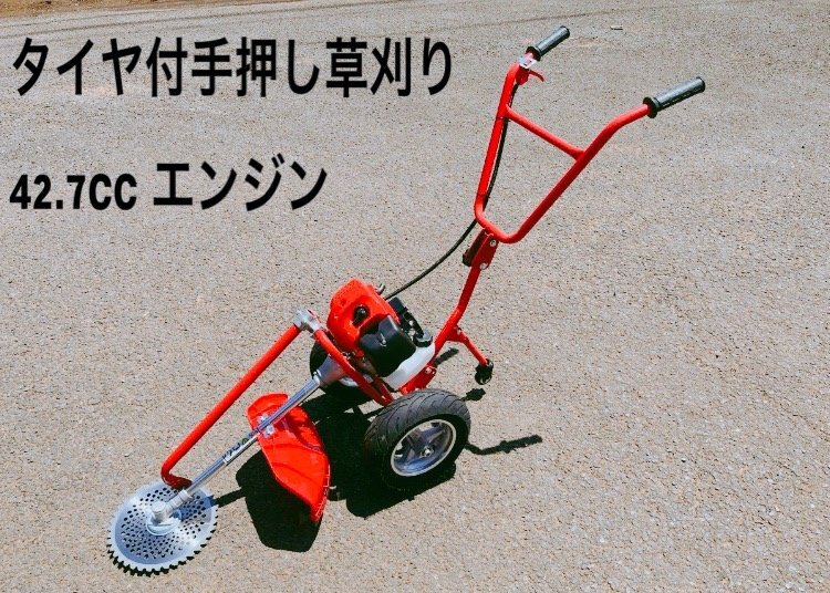 - タイヤ付エンジン草刈機 手押し草刈り機 らくらく作業 最強42.7cc チップソーおまけ付 新品
