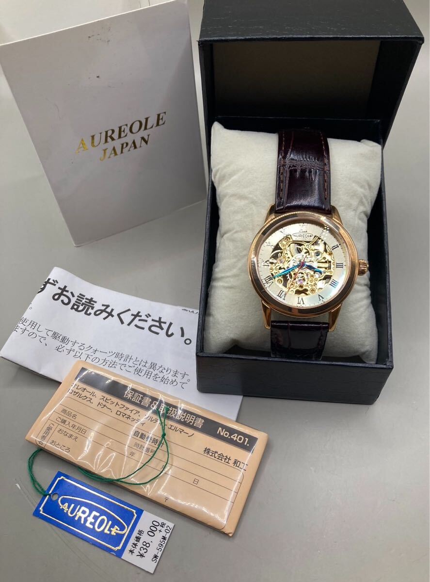 > 稼働 △ AUREOLE 腕時計 SW-595M スケルトン 自動巻き ゴールド ブラウンレザー オレオール 箱 説明書つき △294077