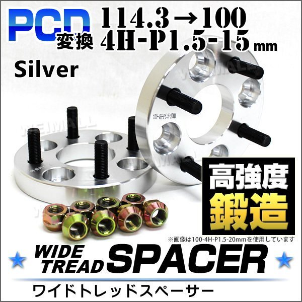 > Durax正規品 PCD変換 ワイドトレッドスペーサー 114.3→100-4H-P1.5-15mm 銀 4穴のPCD114.3mmからPCD100mm ホイールスペーサー