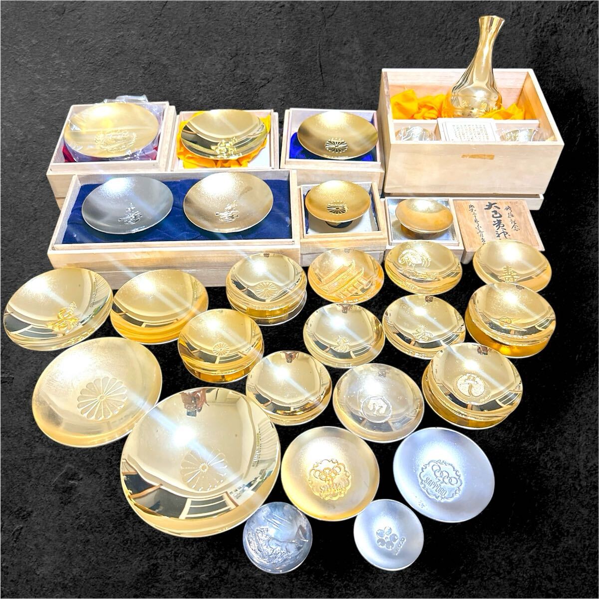 - 現状品 金杯 金盃 盃 酒器 金メッキ 24KGP 刻印 約3kg まとめ 縁起物 記念品 コレクション インテリア 置物 オリンピック EXPO YU