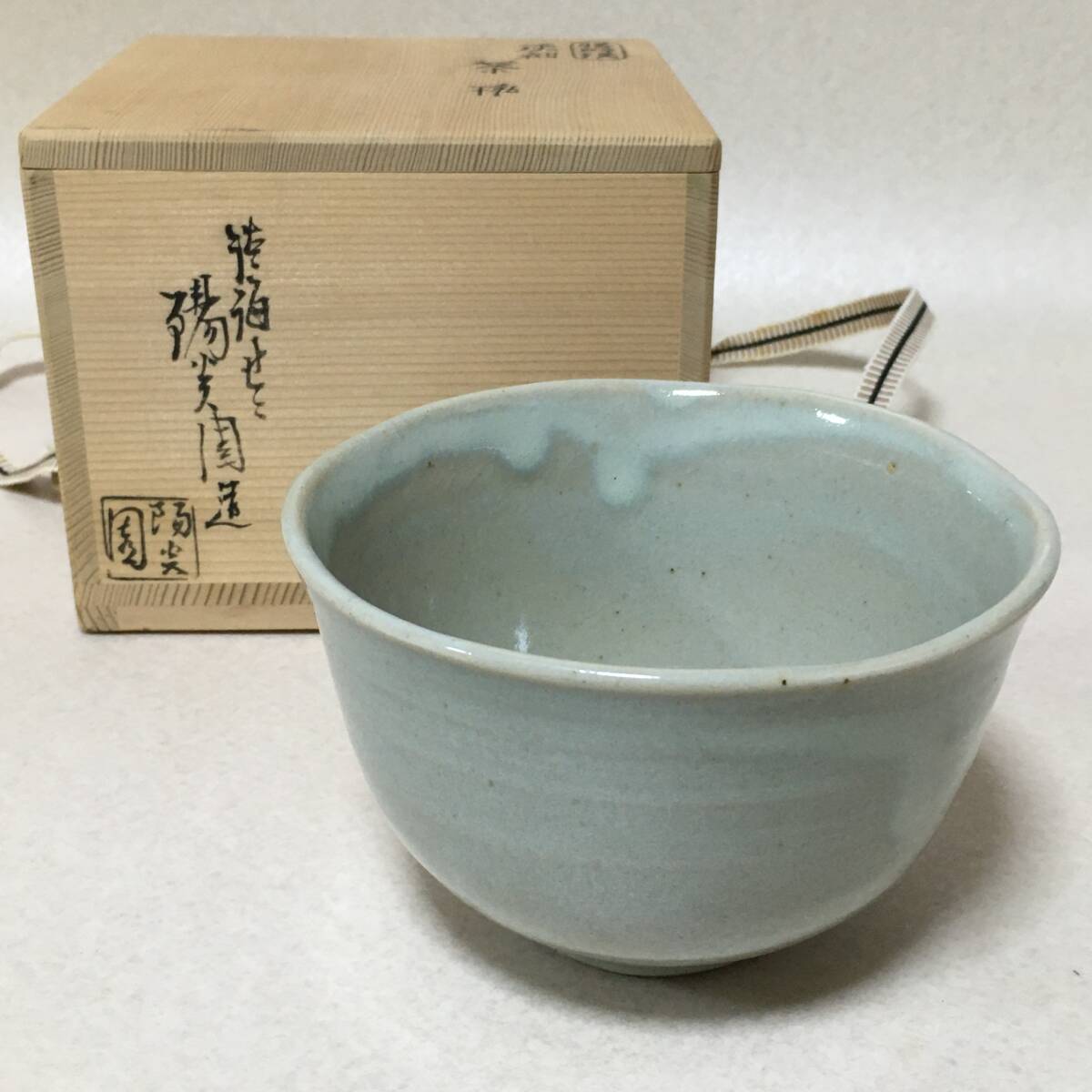 - E835 陽炎園 淡海ぜぜ 岩崎新定 膳所焼 灰釉 茶碗 共箱 茶道具