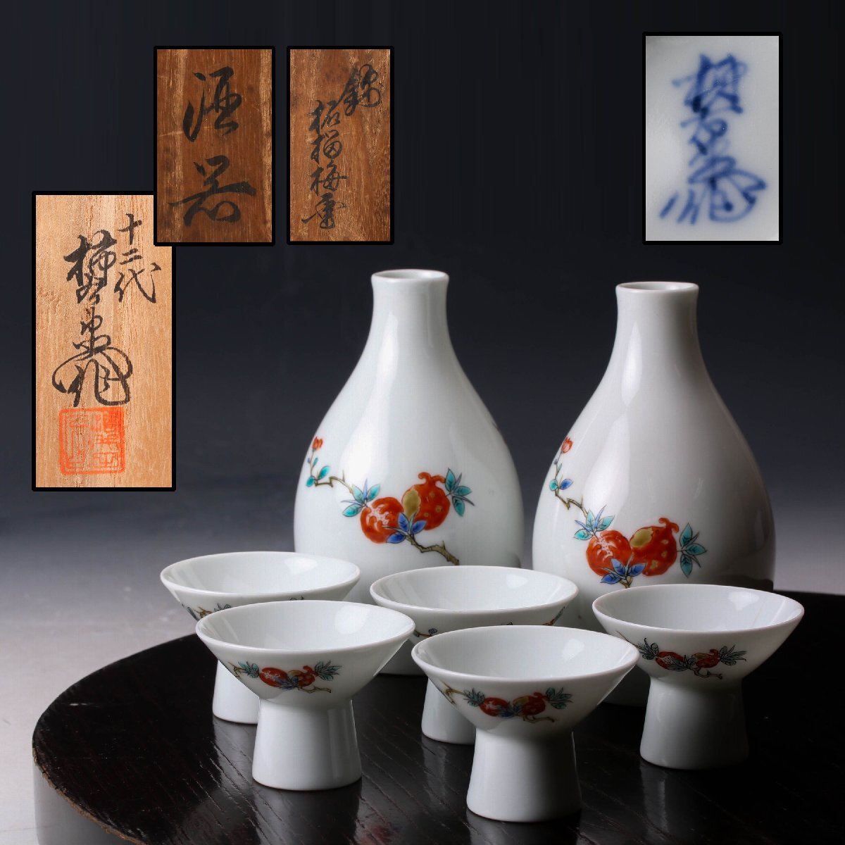 > 【佳香】十二代 酒井田柿右衛門 錦柘榴梅絵酒器揃 徳利 二客 盃 五客 共箱 本物保証