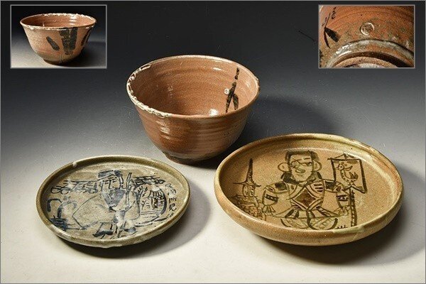 - U08018 越中 三助焼 皿 茶碗 三点 皿絵付: 版画家 金守世士夫 茶碗 復興 城端焼 野村満花城 筆 /3F
