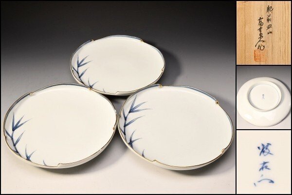 - U08488 肥前皿山 富右衛門 染付 口金 葭画 葦画 皿 3客 共箱 /G146