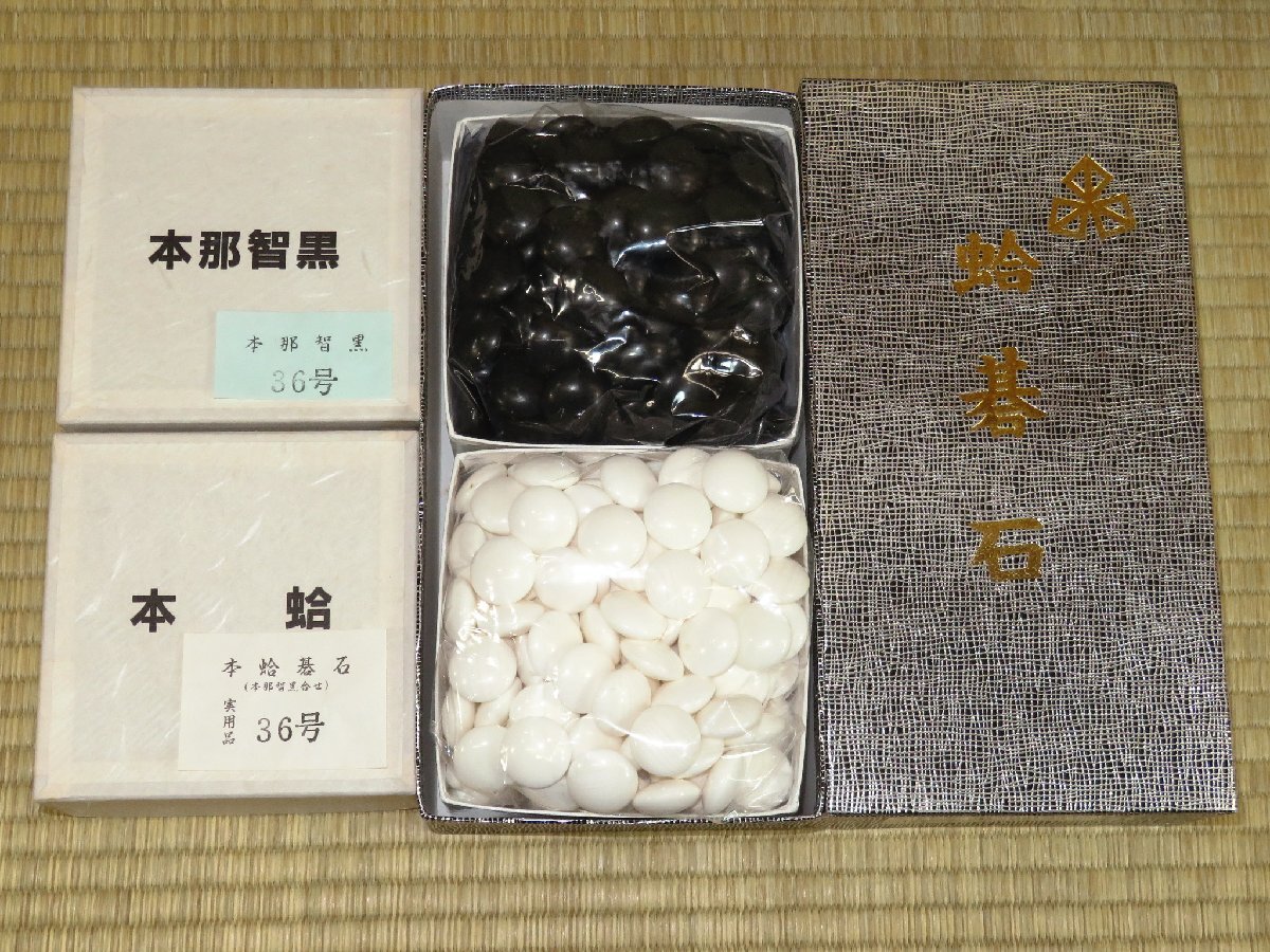 1000円スタート▲本蛤碁石36号実用▲元箱付き未使用品 材質不明碁笥・オマケ付き(囲碁)