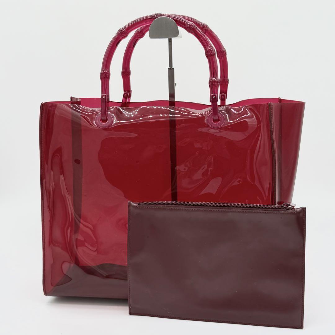 - 【良品】GUCCI グッチ バンブー クリアトートバッグ ハンドバッグ A4収納可 肩がけ ヴィンテージ メンズ レディース レッド系 AG331011