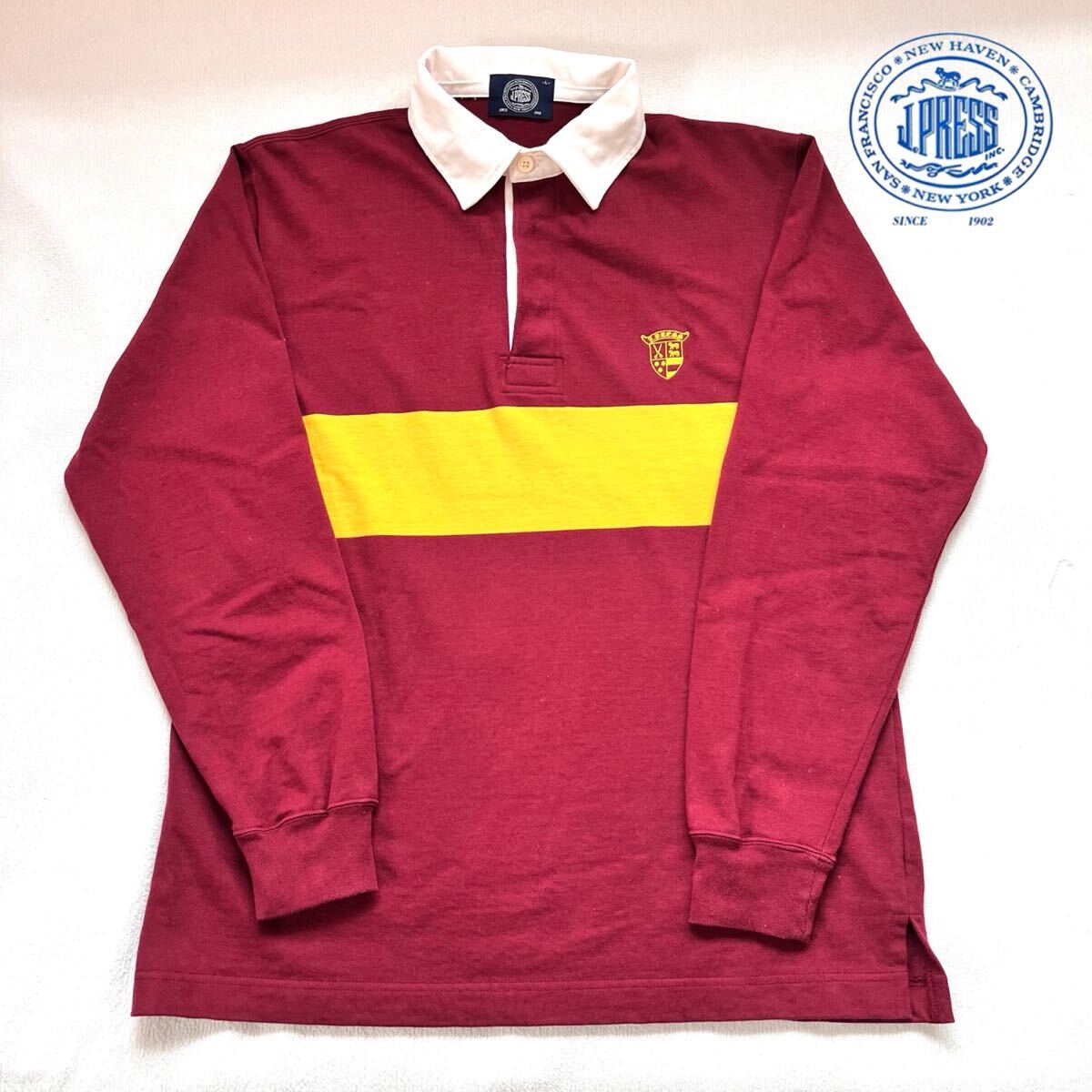 - J.PRESS ジェイプレス 長袖 ポロシャツ ラガーシャツ L ボーダー 赤 ワインレッド イエロー オンワード樫山 綿 100% アメカジ メンズ