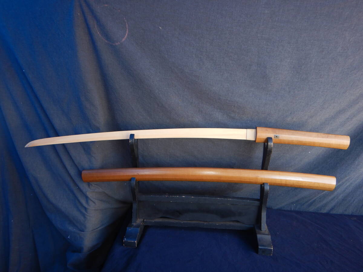 - 白鞘 「主水正藤原清正 佐土原島津家伝来 寒山観」が鞘に墨書き 花押 2尺2寸5分 全長:97.5cm 刀身:67.2cm 刀身は木製 日本刀 刀剣