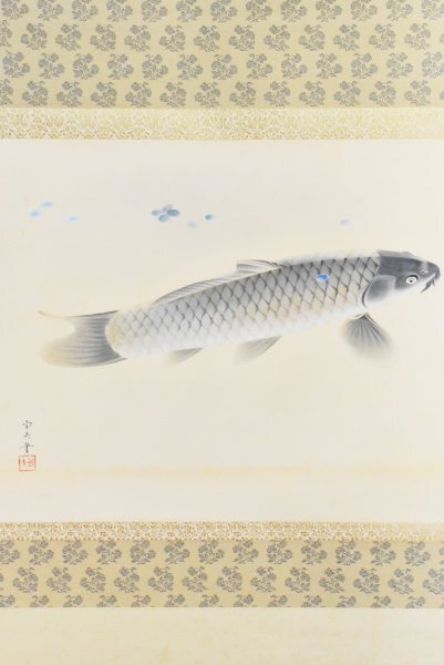 - K6424 真作 河原勇夫「鯉」絹本 共箱 二重箱 肉筆 三宅鳳白師事 日本画 中国 書画 茶掛 掛け軸 掛軸 古美術 名古屋の人 KOI
