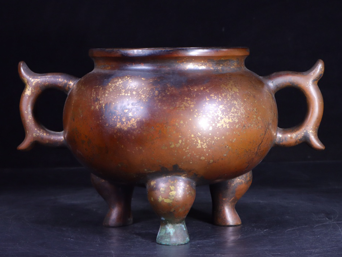 - ▽鴻▽明朝時代 古銅彫 洒金三足龍耳炉 宣徳年製 時代物 中国古美術 骨董品