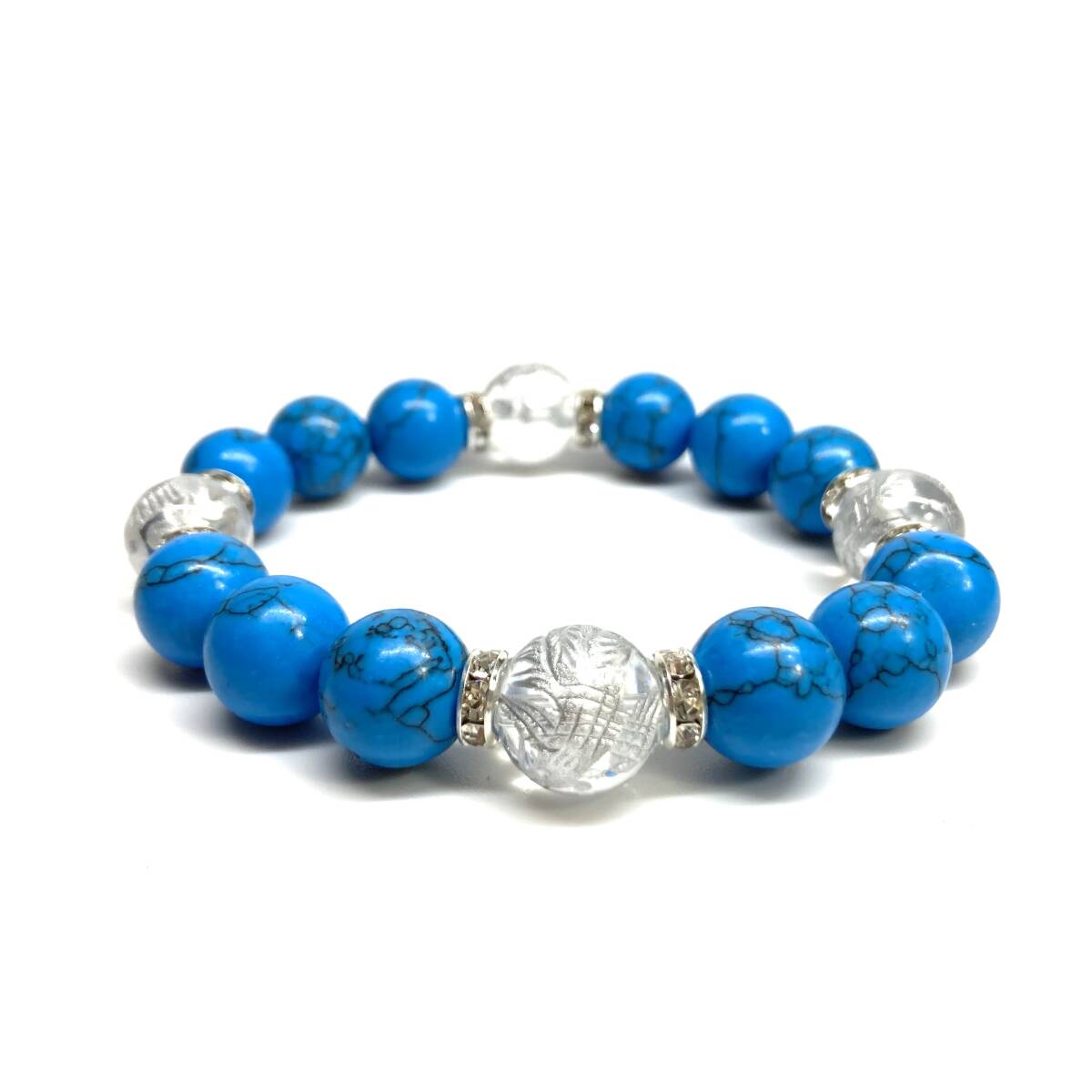 - 四神獣銀彫水晶×ターコイズ 12mm パワーストーン ブレスレット青龍 白虎 玄武 朱雀 運気上昇 お守り 金運 健康運 四神獸 四神相応 S