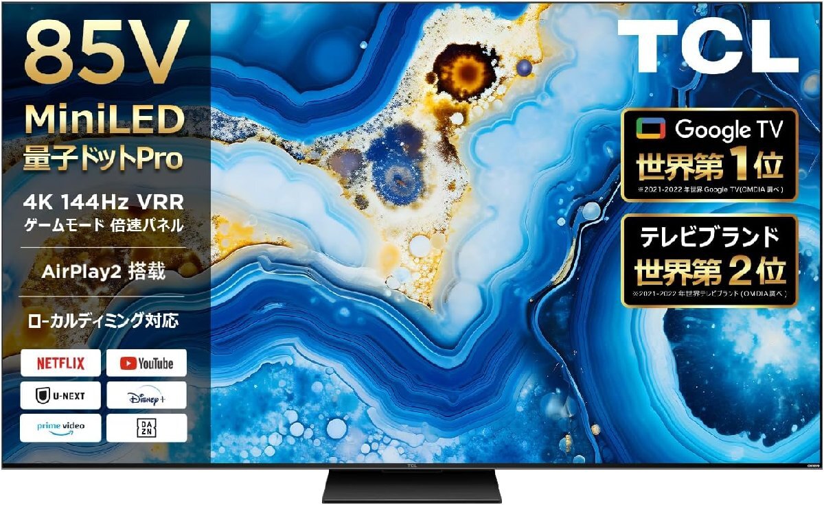 精密機器となりますので輸送中の衝撃や振動で外部破損ではない不具合が起きる場合もあります。故障時の返品や交換は出来ませんので、落札者様でご対応ください。保管輸送中に箱のテープ止め部分の剥がれや箱に汚損ができたため安く仕入れられました。-----------------------------------------------------------------------------------------------------------https://tv.google/intl/ja_jp/https://www.tcl.com/il/en/tvs/qm8b-----------------------------------------------------------------------------------------------------------この商品について