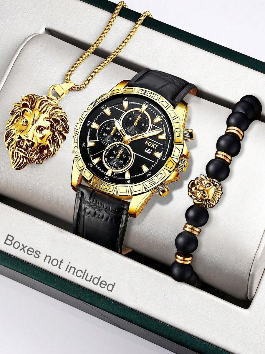 - 腕時計 メンズ セット 1セット メンズ腕時計 ブラックPUストラップ カジュアルスポーツクォーツ腕時計 カレンダー付き、夜光秒針