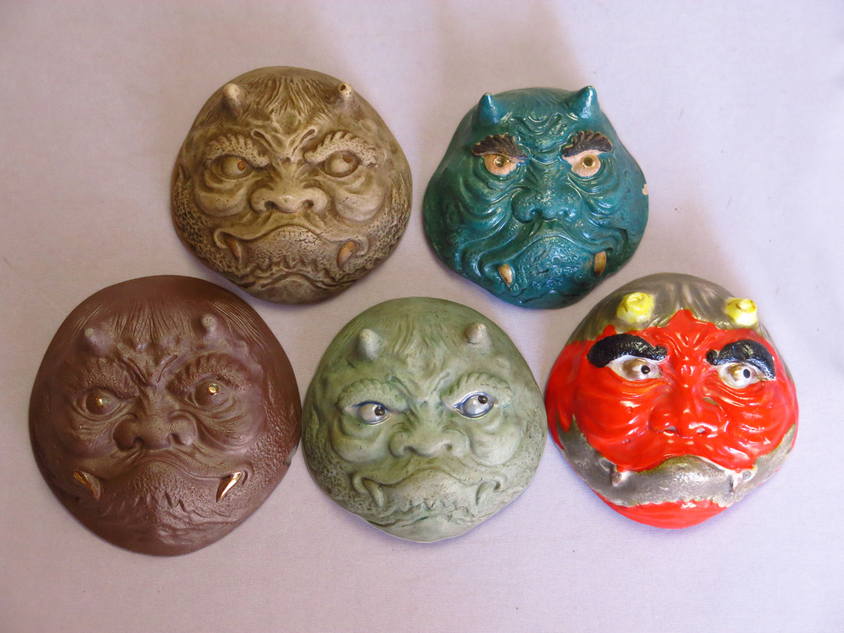 > への字口鬼面盃五個、色変わり鬼面、見込はお多福と藤娘、節分盃、鬼外福内杯、おにちょこ、ぐい呑み