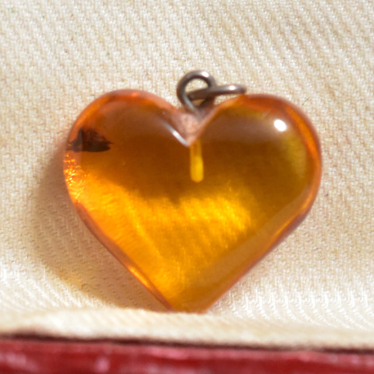 > アンティーク/ヴィンテージ コニャック色アンバー/琥珀のハートのペンダントトップ/チャーム 厚みあり コロンとしています 本物保証