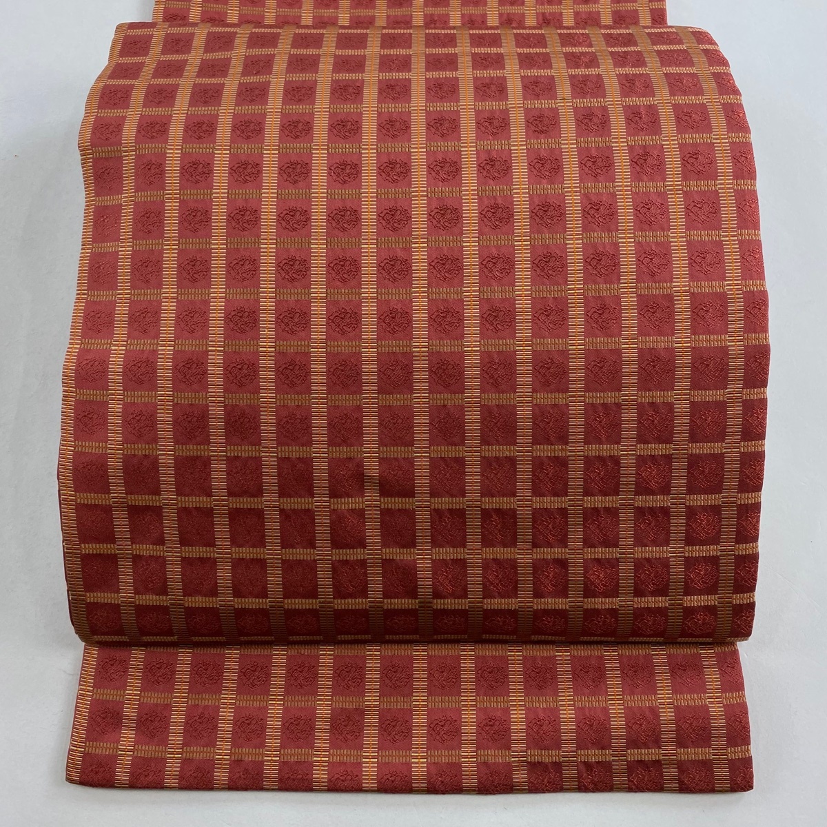 - 【美品】 開き名古屋帯 優品 格子 地紋 えんじ色 正絹 【中古】