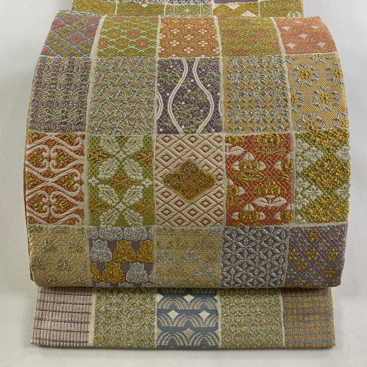 - 【美品】 袋帯 逸品 誉田屋源兵衛 落款 誉文彫金 立涌 花菱 金銀糸 箔 ベージュ 全通 正絹 【中古】