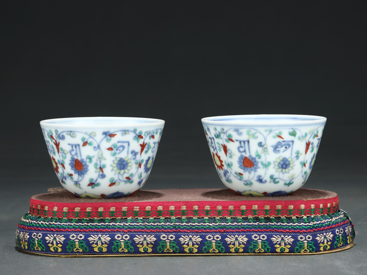 - ▽鴻▽明朝時代 陶磁器 成化年製 斗彩纏枝蓮梵紋杯一対 箱付き 染付 時代物 中国古美術 骨董品