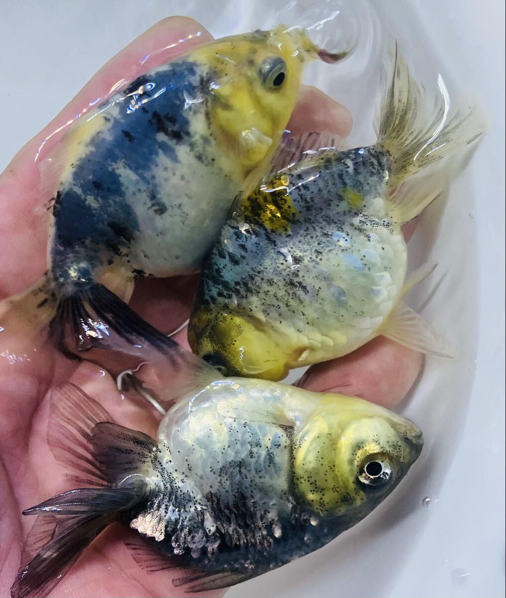 - 【中金 飼育3匹セット】墨写り煇鱗オランダ獅子頭 約8㎝± 中国産金魚 (M6)将来有望柄個体