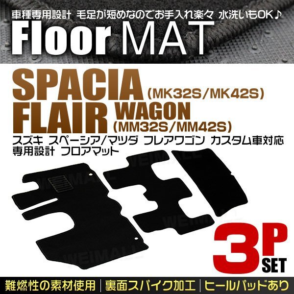 - スズキ スペーシア MK32S MK42S フロアマット 3点セット カーマット マツダ フレアワゴン MM32S MM42S 難燃性 ヒールパット付 黒ブラック