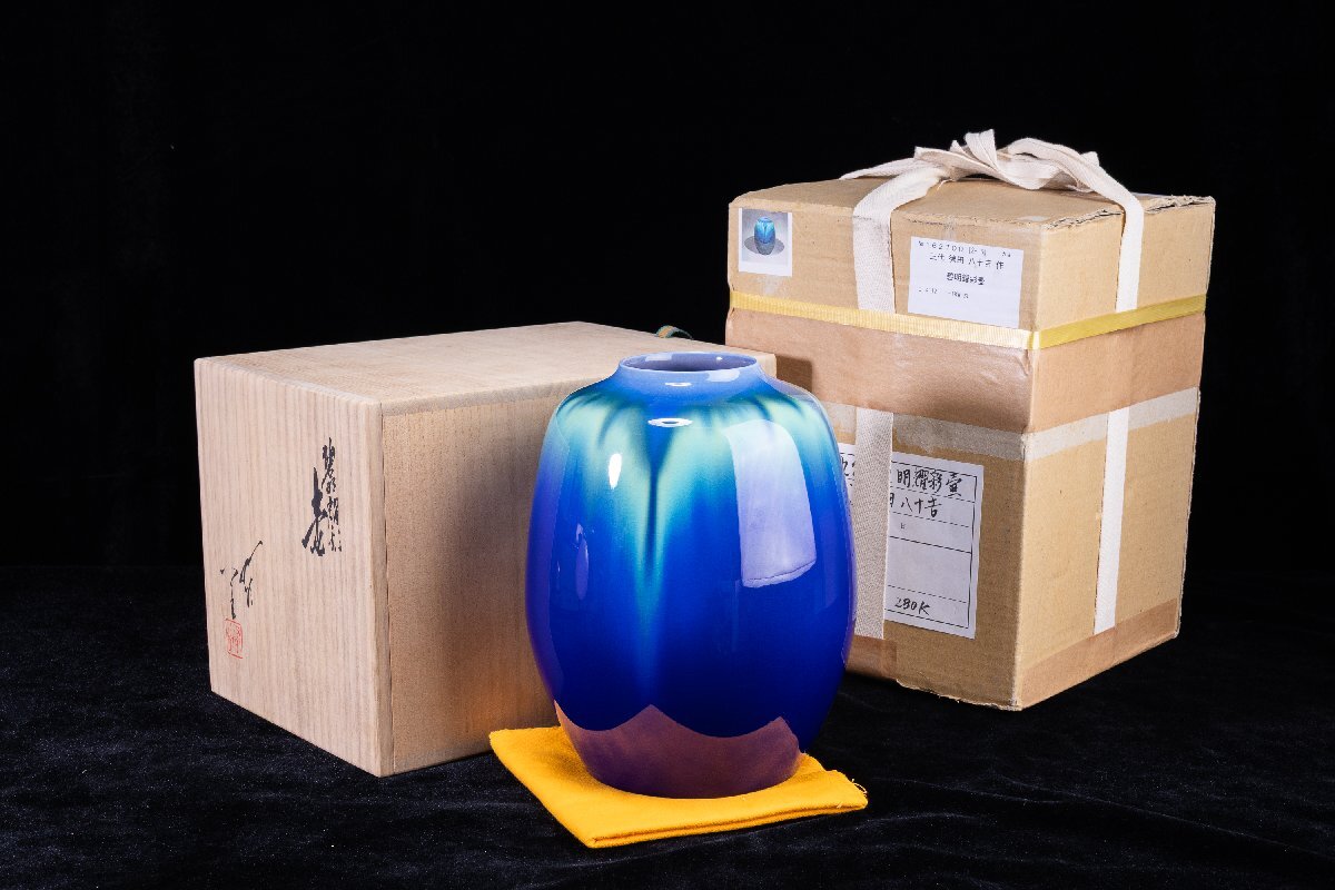 - 【珍品堂】1円から M60-P20 九谷焼 人間国宝 三代 徳田八十吉 作 在銘 碧明耀彩 壺 高21cm 共箱 木箱 共布 飾壺 花器 置物 骨董品 時代物