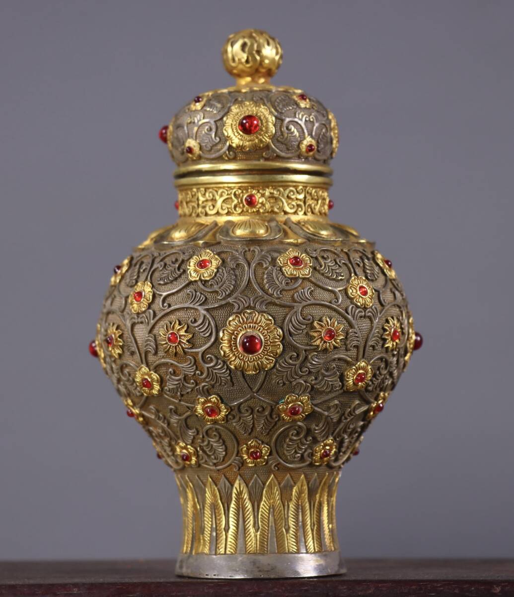 - ◆珍蔵◆中国古美術 大唐貞觀 古銅製 塗金 塗銀 嵌寶紅石 將軍罐 細密細工造 置物 古賞物 骨董品 時代物 A17