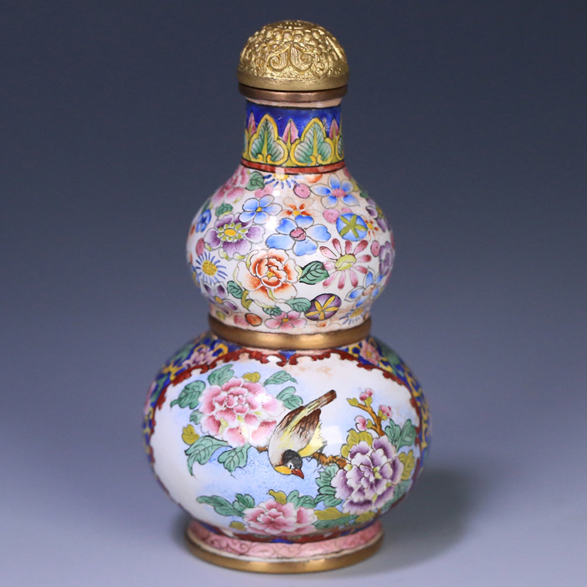 - ▽鴻▽清時代 乾隆年製 銅胎 画琺瑯彩花鳥紋瓢箪型鼻煙壺 時代物 中国古美術 骨董品
