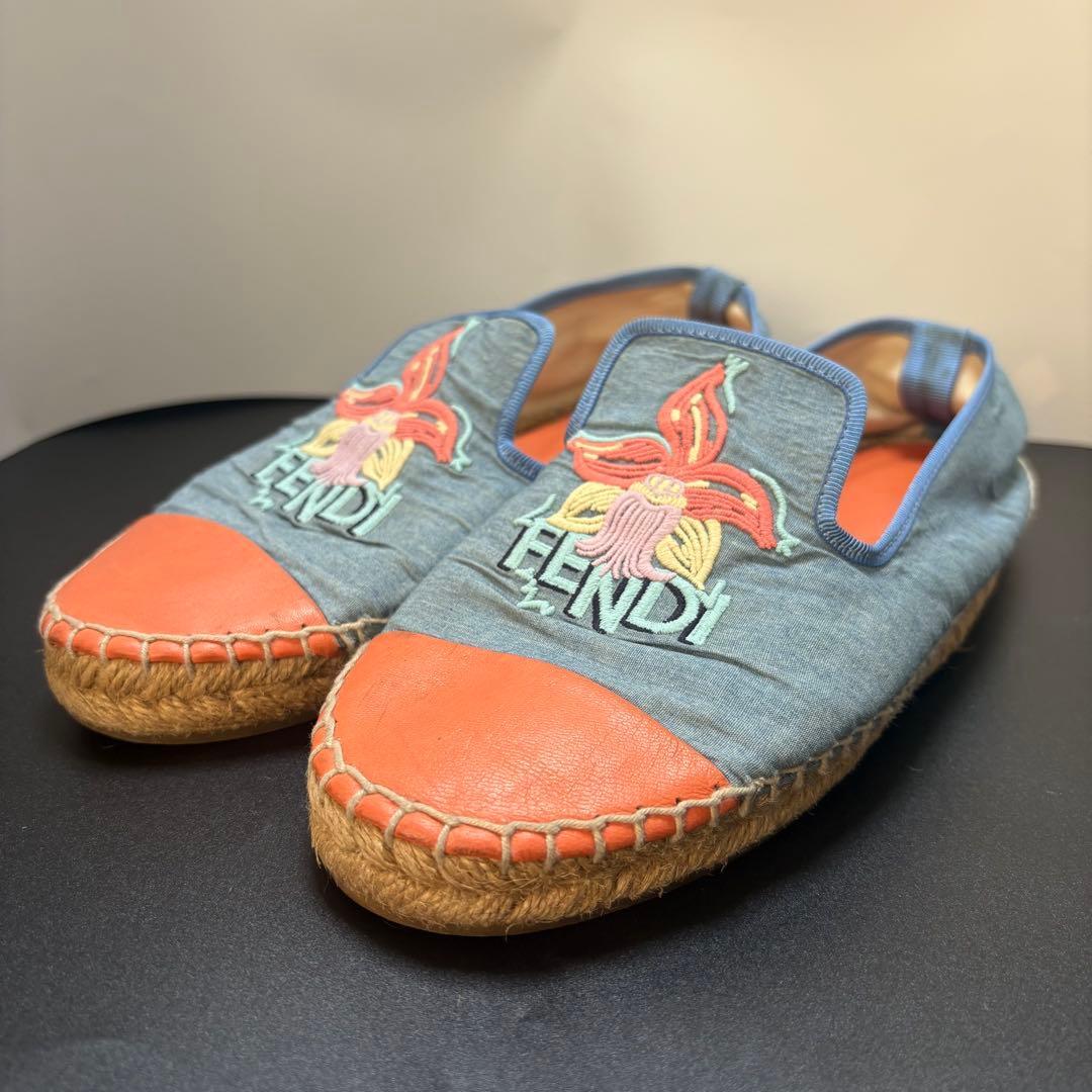 > FENDI フェンディ デニム エスパドリーユ ロゴ刺繍 スリッポン シューズ 36 23cm レディース ブルー×オレンジ