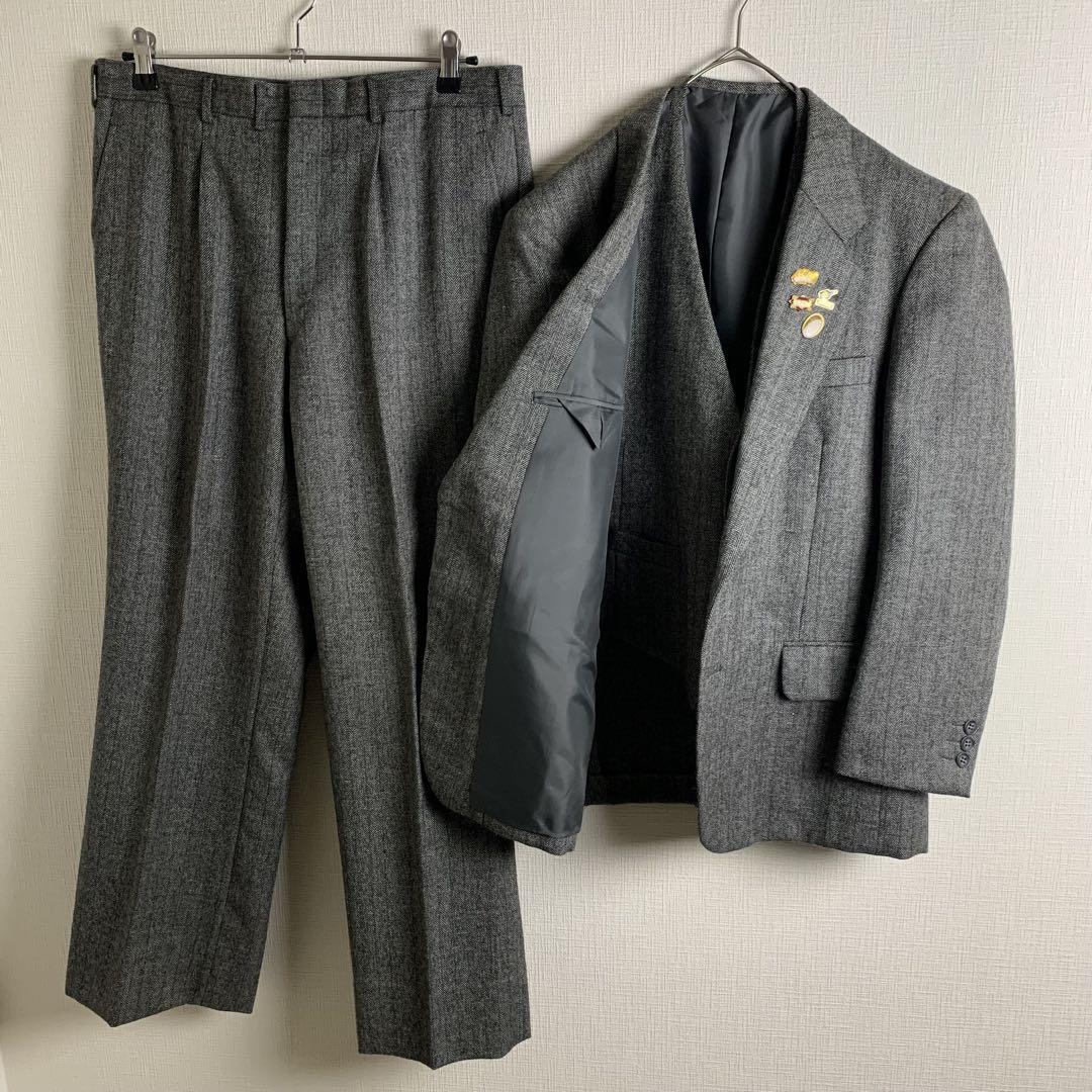 - スリーピース ヘリンボーン グレー セットアップ ベスト付き メンズ スーツ ピンバッジ セレモニー ビジネス 古着