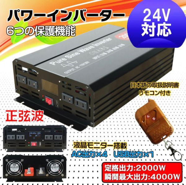 > ★送料無料・30日間保証付き★インバーター 2000W 【正弦波24V専用】リモコン付き モニター表示 車 コンセント4個 USB1個 AC100V 直流変換