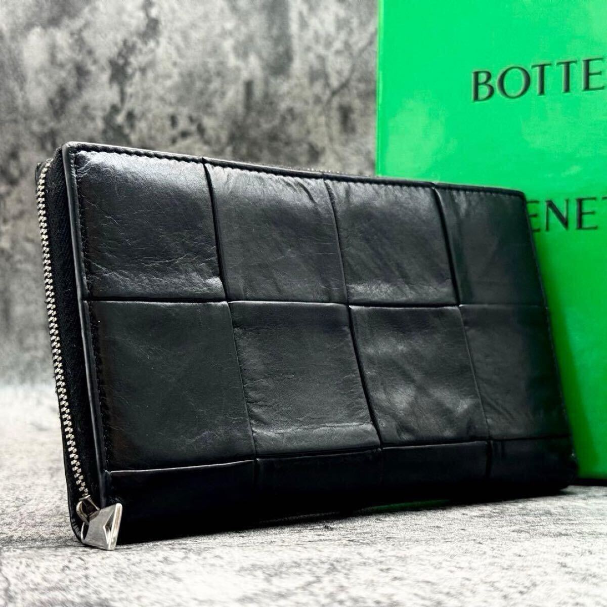 > ■極美品 RFID■BOTTEGA VENETA ボッテガヴェネタ シワ加工 カセット マキシイントレ 編み込み メンズ ビジネス 長財布 ラウンド レザー 黒