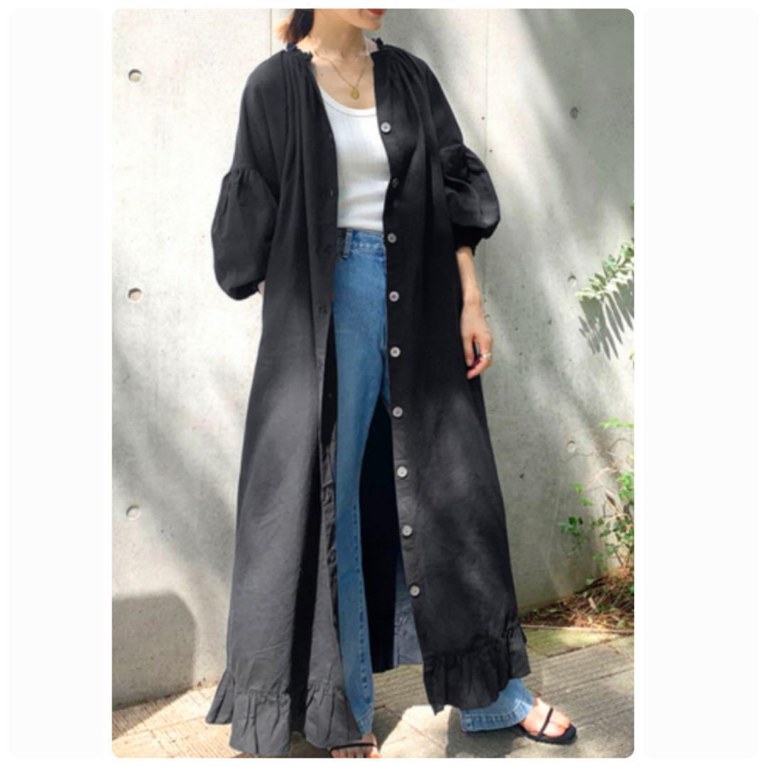 - 美品 イエナ コットン リネン ロング ワンピース 黒 フリル 前開き ギャザー S