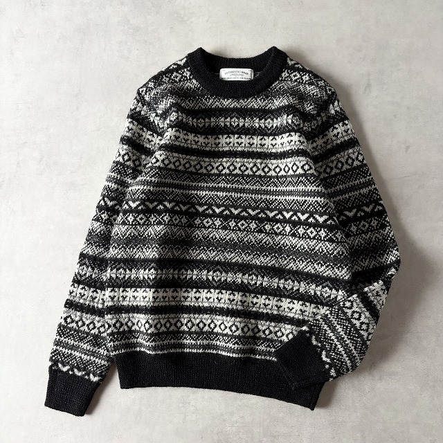 > 美品 グリーンレーベル リラクシング×ブリティッシュウール フェアアイル柄 クルーネック ニット セーター メンズ(S) 黒 白 毛 / r-979