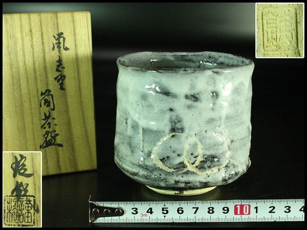 - 【金閣】茶道具 山口錠鐡作 鼠志野 筒茶碗 未使用 共箱 旧家蔵出 送料無料(A670)