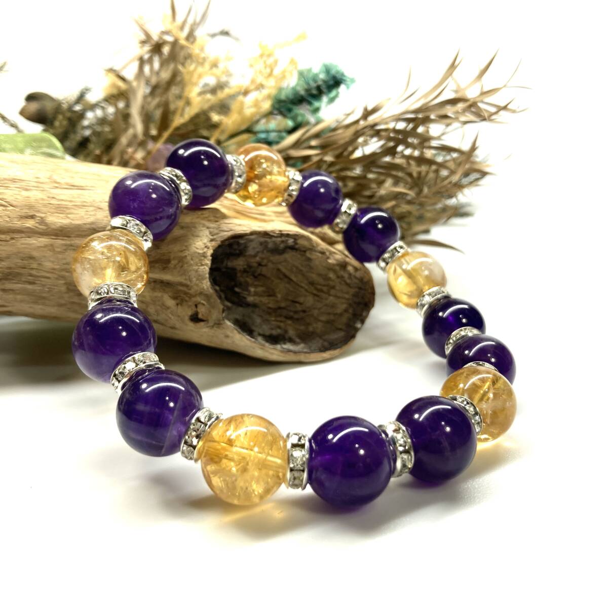 > シトリン&アメジスト パワーストーン ブレスレット 天然石ブレス (シルバー) 12mm 金運 仕事運 メンズ・レディース 男性 女性 #2