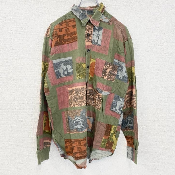 - 古着 used SADEcut 長袖プリント柄シャツ レトロデザイン 胸ポケット カジュアル グリーン カーキ