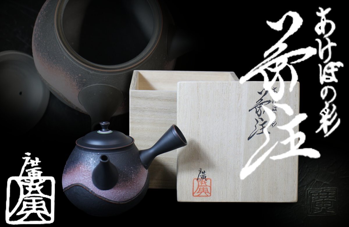 > 【江】常滑焼 鯉江廣造 あけぼの彩 黒泥花地紋横手茶注 高さ10㎝ 在銘 共箱 古美術品(茶道具煎茶器急須土瓶)X1873 LTroiu