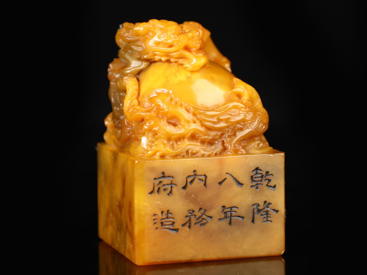 - ▽鴻▽清朝時代 寿山石 田黄石彫 龍鳳鈕印章 乾隆八年内務府造 箱付 時代物 中国古美術 骨董品