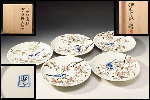 > U07051 東京芸大 伊志良光 染付 釉裏紅 四十雀桜文 組皿 皿 五 共箱 /TZ